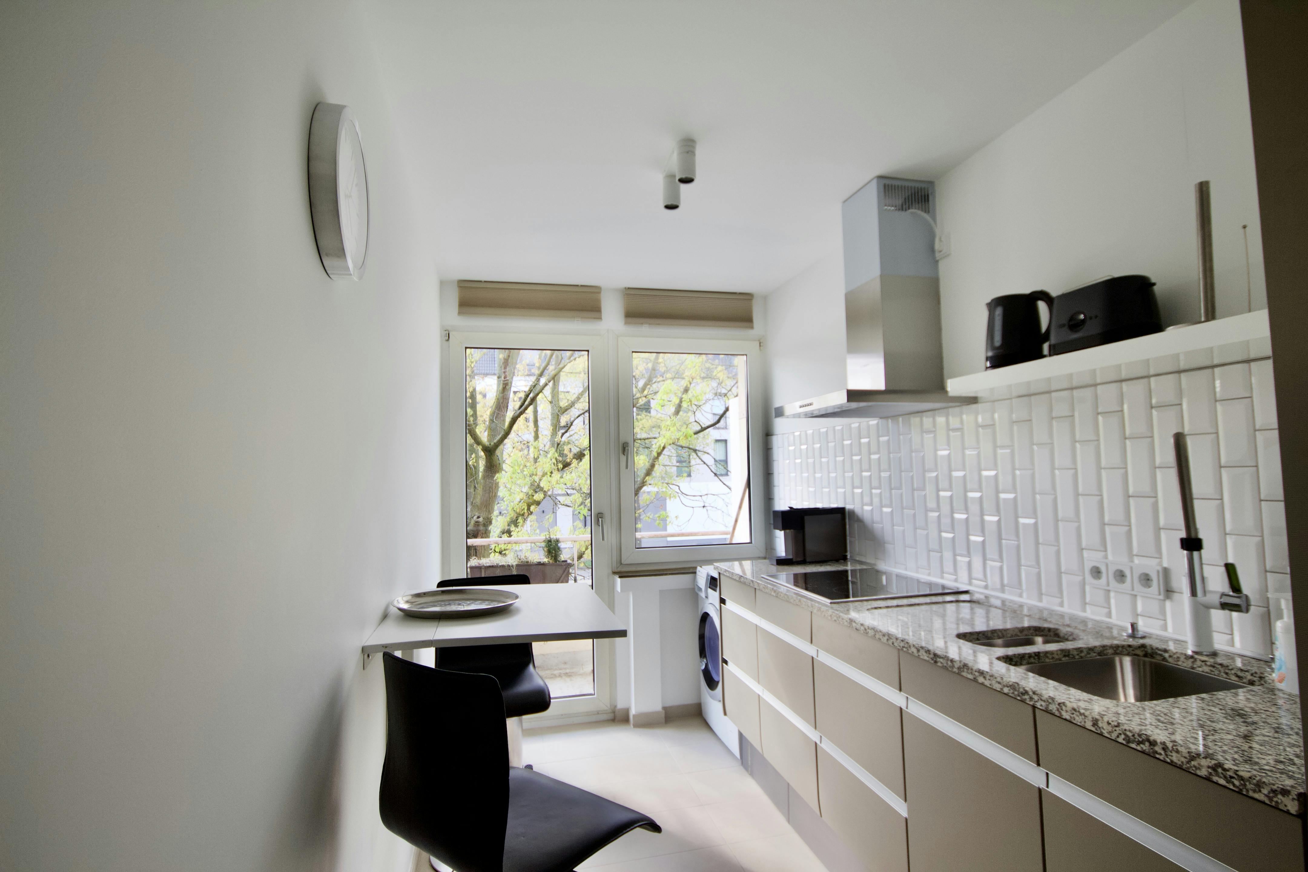Genieße ein stilvolles Erlebnis in dieser zentral gelegenen Unterkunft. Der Dielenbereich verleiht der großen 2-Zimmer-Wohnung ein großzügiges Entree. Das topmoderne Wannenbad mit Duschgelegenheit lässt keinerlei Komfort missen. Die große Küche ist komplett ausgestattet u.a. mit Spülmaschine, Backofen, Waschmaschine etc. Am Hochtisch kann der Frühstückskaffee eingenommen werden. Das Doppelbett (160x200) steht vor dem begehbaren Kleiderschrank. Über die Küche und das Wohnzimmer ist der Balkon zu erreichen.