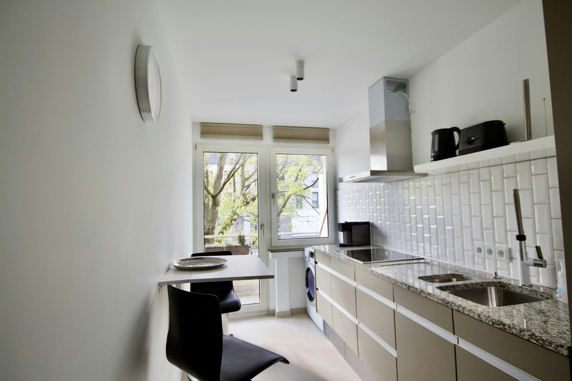 Genieße ein stilvolles Erlebnis in dieser zentral gelegenen Unterkunft. Der Dielenbereich verleiht der großen 2-Zimmer-Wohnung ein großzügiges Entree. Das topmoderne Wannenbad mit Duschgelegenheit lässt keinerlei Komfort missen. Die große Küche ist komplett ausgestattet u.a. mit Spülmaschine, Backofen, Waschmaschine etc. Am Hochtisch kann der Frühstückskaffee eingenommen werden. Das Doppelbett (160x200) steht vor dem begehbaren Kleiderschrank. Über die Küche und das Wohnzimmer ist der Balkon zu erreichen. Die Wohnung befindet sich in beliebter Wohnlage in Neuss-Reuschenberg direkt am Park, der zu den Erft-Auen führt. In unmittelbarer Umgebung der Immobilie fahren einige Buslinien. Zu Fuß erreichen Sie verschiedene Ärzte, Physiotherapeuten, Restaurants, Bäckereien, Supermärkte...
